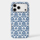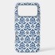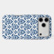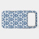Decorative damask surface pattern design in dark blue detail on a white background.
