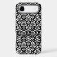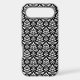 Vintage inspired decorative damask surface pattern design in white detail on a black background.