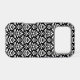 Vintage inspired decorative damask surface pattern design in white detail on a black background.