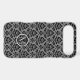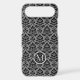Vintage influenced leafy baroque style damask surface pattern design in black detail on a gray background, with encircled initial/letter in light gray on a transparent black circle background, which can be altered and personalized.