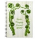 Spiral bound notebook journal with fiddlehead ferns illustration on the front. Light vertical lines are in the background with bright green curls of the fiddlehead along the edges. Customize green text in the center. The Fiddlehead fern is a popular Spring delicacy in certain areas. Use the book as a foraging notebook, specialty cookbook, or personal diary.