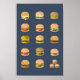Made in Adobe Illustrator. Burgers are (from left to right): Egg, bleu, veggie, buffalo, classic, southwestern, ramen, teriyaki, bbq, bacon, kobe, mushroom + swiss, chilli, double, sliders.