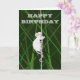 A grey field mouse, in a field of tall green grass, climbing up a twig, its long tail wrapped around the twig for support. The message on the inside of the card says "Have a wonderful birthday, reach for the stars! "