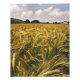 This fine art photography photo print presents a scenic summer landscape of a field of ripening gold, brown and yellow grain, almost ready to harvest. The farm buildings and barns are way in the distance. The stalks are blowing in the wind to form a lovely abstract pattern.