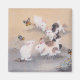 Rabbits jump on the grass, playing with dancing butterflies. Various wild rabbits with or without black or brown spots hop in the soil-brown hues, showing the intimacy of animals and nature. Butterflies with right colours and sky-blue flowers form the picture a more bright and vivid landscape.