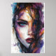 This striking wall art features a vivid watercolor portrait of a woman whose piercing blue eyes command attention. The piece blends bold brushstrokes with splashes of vibrant colours—deep purples, fiery oranges, cool blues, and warm golds—creating a dynamic sense of motion and emotion. Fine ink-like lines weave through her hair, adding depth and texture, while her crimson lips and intense gaze evoke mystery and strength. Perfect for modern interiors, art lovers, and anyone drawn to powerful, expressive portraiture, this artwork makes a dramatic focal point in any space.