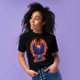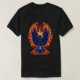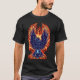 A powerful, black eagle soars through a fiery inferno, its wings outstretched and ablaze. The eagle's piercing eyes and sharp talons grip a human skull beneath it, symbolising its dominance and control over mortality. The fiery background creates a dramatic and intense atmosphere, highlighting the eagle's strength and resilience.