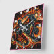 A fierce motorcycle with a sidecar, engulfed in vibrant flames, speeds forward with a skull figure, capturing the thrill of an intense ride.
