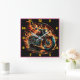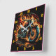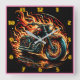 A vibrant motorcycle engulfed in flames speeds across a dark surface, its fiery trail illuminating the night with energy and passion.