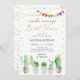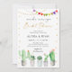 This fun invitation features watercolor succulents with gold glitter accents and color fiesta flags.