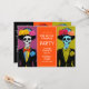 The invitation for the Dia de los Muertos party is a vibrant and festive design. The background is divided into three vertical sections in purple, yellow, and pink. On the left, a skeleton in a blue suit with an orange bow tie and a pink rose on the lapel stands proudly. The middle section features customisable text.