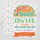 Taco ‘bout a party! Gather family and friends to celebrate your child's birthday Mexican style with these bright and fun fiesta invitations. A hand lettered party invitation with a taco and fiesta style lettering over a confetti background.