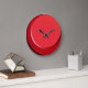 Retro modern red wall clock in a crescent moon shape with a iridescent red grid pattern on the inside.