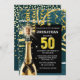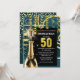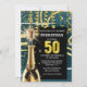 A modern faux gold on dark teal blue design featuring a faux gold bottle of sparkling wine with an exploding cork; sparkling gold glitter and vertical hanging streamers next to white text templates on black that has a large numeral fifty in gold on it. These are ideal for all 50th / fiftieth birthday and business celebrations. Personalise the wording to suit your event.