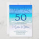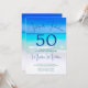 An enticing beach scene is the background for this Fifty and Fabulous Beach Party birthday invitation.