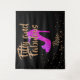 Fifty and Fabulous girly sparkly hot pink gold text tapestry or backdrop. Big sparkly hot pink high heel shoe on black background. Gold text states Fifty and Fabulous and multisided gold dots. Is elegant. Fill in your information at bottom of backdrop.