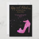 Elegant Pink and Black Fifty and Fabulous Birthday Party Invitation with gold and pink lettering on black background. Glittery pink shoe done by artist on front of invitation. Pink dots sprinkled on both front and back.