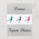 Girl's Figure Skater Postcard Personalised w/ Her Name. Silver faux glitter sparkle with 3 different coloured figure skaters in the centre on front and a light grey background on the backside with a tiny black figure skating silhouette in the bottom right corner.