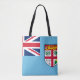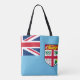 The Fijian flag is a light blue ensign with the shield-of-arms in the fly. The used colours in the flag are blue, red, white. The proportion of the Fijian flag is 1:2. The Flag of Fiji was adopted in 1970. The first use of the current flag design was in 1924. The last change to the current Fijian flag design was in 1970.