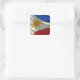 The national flag of the Philippines is a horizontal bicolor with equal bands of royal blue and scarlet red, and with a white equilateral triangle at the hoist; in the centre of the triangle is a golden yellow sun with eight primary rays, each containing three individual rays; and at each vertex of the triangle is a five-pointed golden yellow star.
