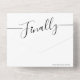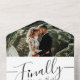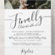 Finally belated wedding party with a tear-off RSVP in simple timeless black and white. Typographic script on a white background design wedding invitation reads Finally Celebrate with us. Simple modern contemporary design, personalise with your own belated wedding or renewal venue, couples name and reply details, and your favourite photo. This design requires no extra envelopes and has a detachable perforated RSVP for easy replies. Matching wedding products and other colour options available in the store. Design by www.mylittleedenweddings.com