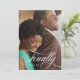 An elegant save the date announcement card, that features your favourite engagement photo overlaid with "Finally" in elegant white script font and your wedding date. The reverse is in solid black with your wedding details in black.