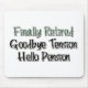 Finally Retired: Goodbye Tension, Hello Pension, hilarious retirement quote. This cute and funny retirement saying that would make a humourous retirement gift.