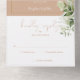 All in one postponed wedding invitation featuring botanical greenery rustic leaves falling across a gold arch enclosing elegant typography on a tan background. The invitation includes a perforated RSVP card that can be individually addressed or left blank for you to handwrite your guest's address details. Designed by Thisisnotme©
