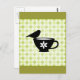 Faded green check background with silhouette of teacup and a perched finch