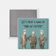 This magnet features a vintage image of three well dressed men, on a teal background, with the text, "Let's play a game of find my tattoo."