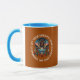 Let your dreams soar and find your peace mug. Dream catcher, feather and brown background. River and mountains.