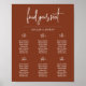 A modern and elegant table seating chart in terracotta burnt umber background and a rustic wood boho theme featuring a casual script calligraphy lettering. Perfect for table seating charts of up to 6 tables.