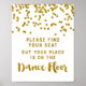 Please find your seat but your place is on the dance floor wedding sign poster in white and gold confetti pattern with handwritten style lettering.