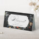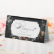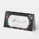 This chic tent sign features an 18th century Dutch floral still life, including white, red and gold tulips and wildflowers on a black background with custom centre label, complementary floral graphics and elegant flowing custom calligraphy.