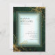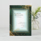 A watercolor background in shades of emerald green is topped by an abstract of fine gold lines and glittering lighting effects to create the pieces of this beautiful wedding suite. The wedding 'Invitation' card shown here also features off-centred text and a beautiful gradient frame to hold all your text. Easily add your own names, wedding date and event details using the provided template. Search ID867 to see other pieces and colour choices for this set.