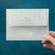 A watercolor background in shades of sage green is used to create the pieces of this beautiful wedding suite. The coordinating wedding envelope shown here also features a beautiful gradient interior topped by an abstract of fine gold lines and glittering lighting effects. Easily add your own names and return address using the provided template. Search ID867 to see other pieces and colour choices for this set.