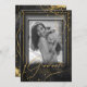 A watercolor background in shades from charcoal grey to black is topped by an abstract of fine gold lines and glittering lighting effects to create this beautiful graduation invitation. The card also features elegant calligraphy and a gradient frame to hold your photo. Easily add your own personal event details using the provided template. Search ID867 to see other pieces and colour choices for this set.