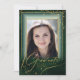 A watercolor background in shades of emerald green is topped by an abstract of fine gold lines and glittering lighting effects to create this beautiful graduation invitation. The card also features elegant calligraphy and a gradient frame to hold your photo. Easily add your own personal event details using the provided template. Search ID867 to see other pieces and color choices for this set.