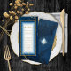 A watercolor background in shades from royal blue to navy is topped by an abstract of fine gold lines and glittering lighting effects to create the pieces of this beautiful wedding suite. The wedding 'Menu' card shown here also features elegant calligraphy and gradient frames to hold your text both front and back. Easily add your own initials, wedding date and menu selections using the provided template. Search ID867 to see other pieces and color choices for this set.