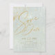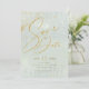 A watercolor background in shades of sage green is topped by an abstract of fine gold lines and glittering lighting effects to create the pieces of this beautiful wedding suite. The wedding 'Save the Date' card shown here also features low, centred text and elegant calligraphy. Easily add your own names, wedding date and info using the provided template. Search ID867 to see other pieces and colour choices for this set.