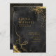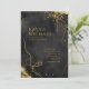 A watercolor background in shades from charcoal grey to black is topped by an abstract of fine gold lines and glittering lighting effects to create the pieces of this beautiful wedding suite. The wedding 'Invitation' card shown here also features off-centred text; and an optional fine gold mesh border on the reverse. Easily add your own names, wedding date and event details using the provided template. Search ID867 to see other pieces and colour choices for this set.