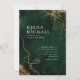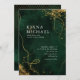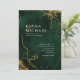 A watercolor background in shades of emerald green is topped by an abstract of fine gold lines and glittering lighting effects to create the pieces of this beautiful wedding suite. The wedding 'Invitation' card shown here also features off-centered text; and a fine gold mesh border on the reverse. Easily add your own names, wedding date and event details using the provided template. Search ID867 to see other pieces and color choices for this set.