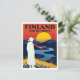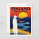 Celebrate the beauty of the Finnish landscape with this striking, vintage-style travel postcard. The highly graphic illustration features a figure standing by a winding blue river, gazing toward a huge yellow sun setting over the blue mountains. The bold, contrasting color palette evokes the "Midnight Sun" of the Finnish summer. The clear, retro lettering reads "FINNLAND FOR HOLIDAYS". This card is ideal for fans of Scandinavian design, collecting retro travel posters, or anyone sending a unique greeting from this beautiful Nordic country.