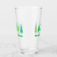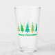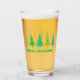 A modern geometric design of five fir trees in teal, turquoise and golden yellow. It reads "Merry Christmas" in matching green text.