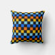 A vibrant chequerboard pattern featuring alternating rows of orange, yellow, light blue, and blue squares against a black background. The design is bold and energetic.