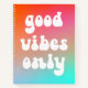 A groovy retro "good vibes only" typography design on a vivid orange, hot pink and aqua blue gradient.
