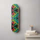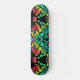 A really cool skateboard with an abstract design in the colours of fire and water on a black background.