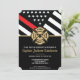 This design features a firemen's flag with black and white stripes, and a thin red line stripe as well. "Congratulations" and a fireman's badge sits above all of the party details for the retiring firefighter, lieutenant, or chief's retirement party. The invitations can also be customised for a firefighter academy graduate.