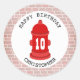 A birthday party sticker featuring an illustration of a red fire hydrant and a brick border. Personalise the text. Look for matching fireman birthday party invitations at Jill's Paperie.