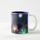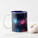 Five sprays of fireworks reflected in the dark water beneath - a bursts of pale blue, rose pink, bright gold, and mint green, and in the centre sparkles of all the colours of the rainbow.